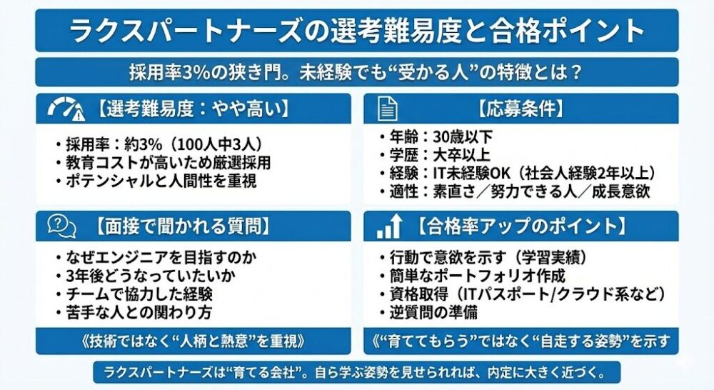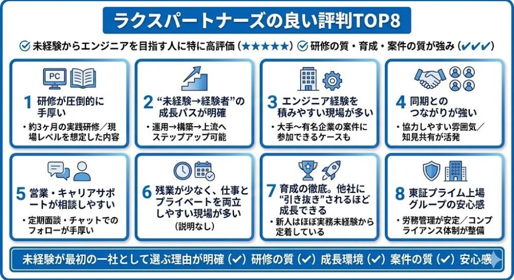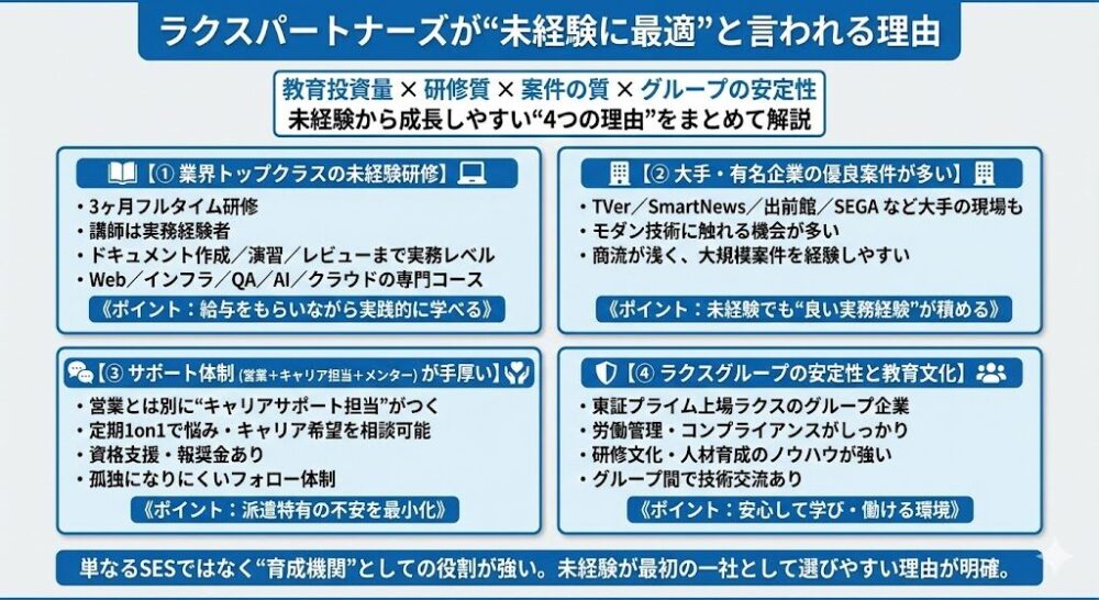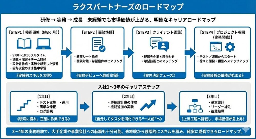 結論として、ラクスパートナーズは「楽に稼げる場所」ではありませんが、「未経験者がエンジニアとしての土台を作る場所」としては、業界でもトップクラスの環境です。