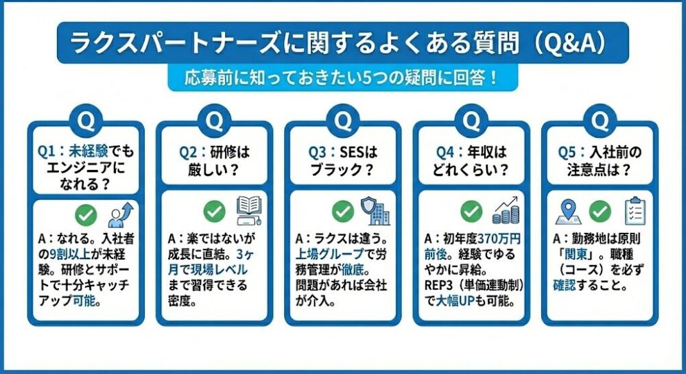 最後に、ラクスパートナーズへの応募を検討している人が抱きがちな、細かな疑問や不安にQ&A形式で回答します。