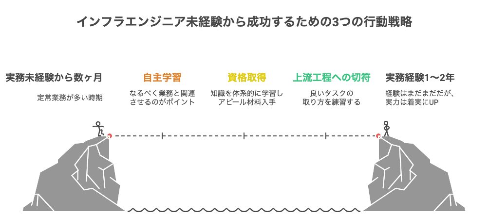 「運用がメインなのであれば、運用設計ができないか」「運用の経験を活かして設計構築の業務を担当」など、今の仕事を土台に設計要素の業務を取りにいきましょう。