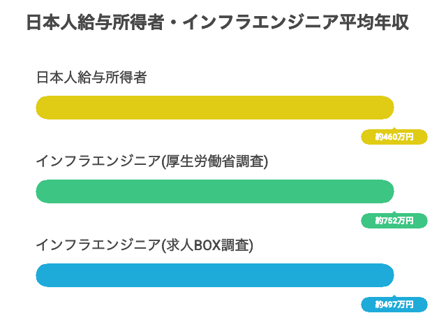 しかし、実際のデータをみると、インフラエンジニアの平均年収は、日本人の平均年収よりも高いです。